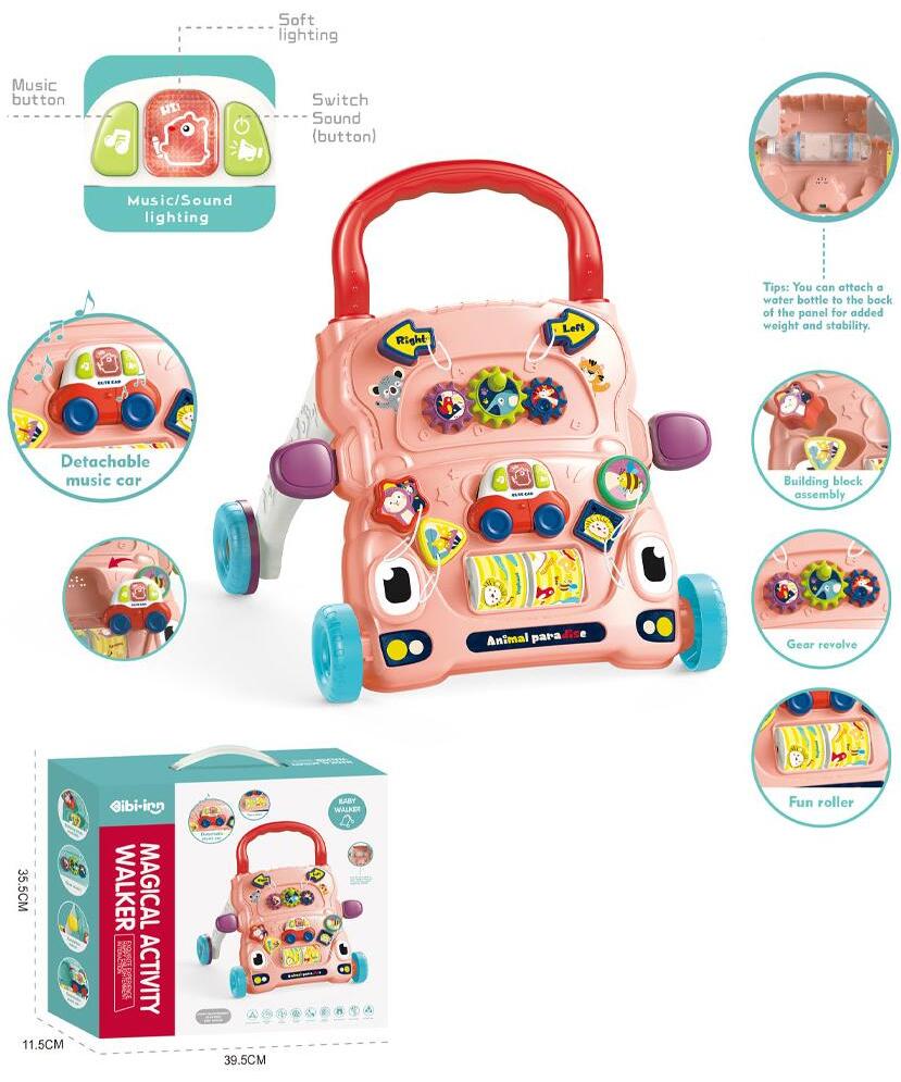 Na prednjem panelu nalazi se odvojiva igračka u obliku automobila koja emituje muziku, rotirajući valjak sa motivima životinja, set za slaganje kockica, zupčanici koji se okreću i ogledalce za istraživanje sopstvenog odraza.