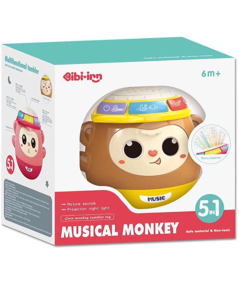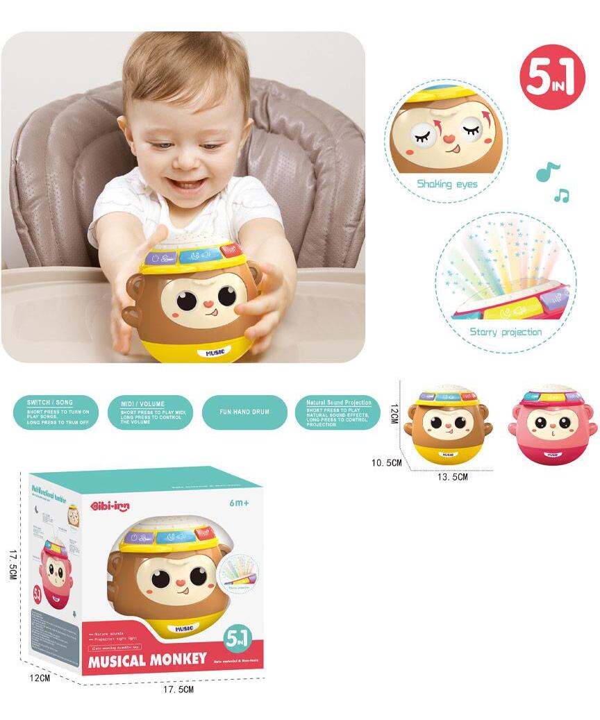 Muzički majmunčić projektor kombinuje pet različitih funkcija koje podstiču razvoj čula sluha, ritma i pažnje.