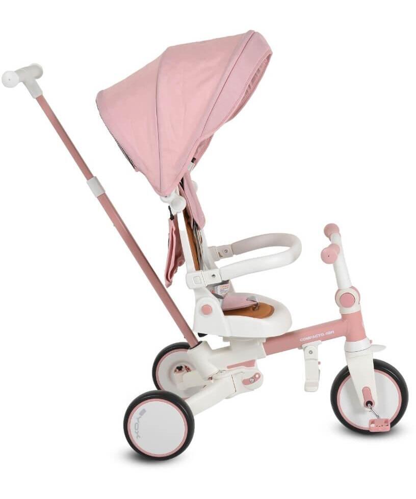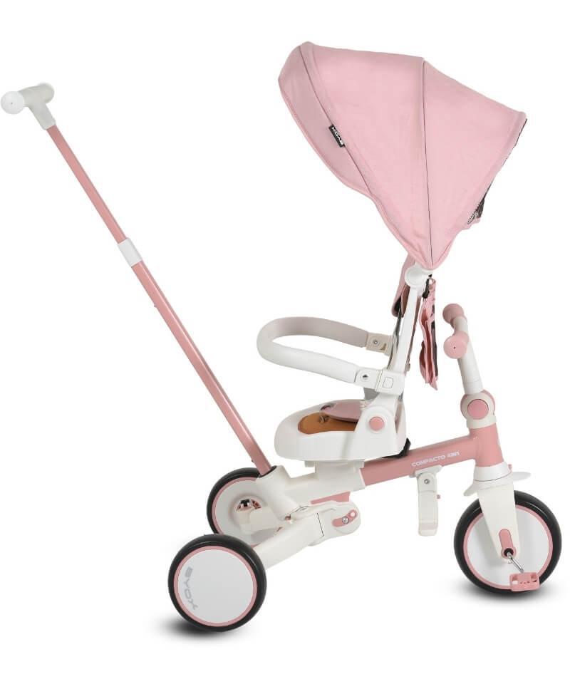 Compacto ima četiri jasno definisane faze korišćenja. Prvo je tricikl sa roditeljskom ručkom, gde odrasli imaju potpunu kontrolu nad pravcem i brzinom. Zatim dolazi faza sa manjim sedištem i bez baldahina, gde dete dobija više slobode. Treći korak je samostalna vožnja bez ručke, a završna faza – balans bicikl – pomaže razvoju ravnoteže i koordinacije.