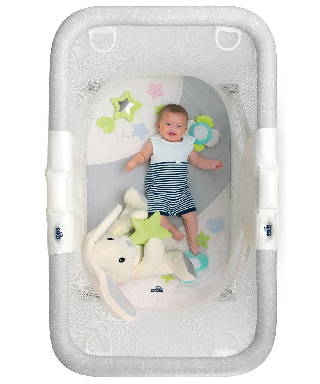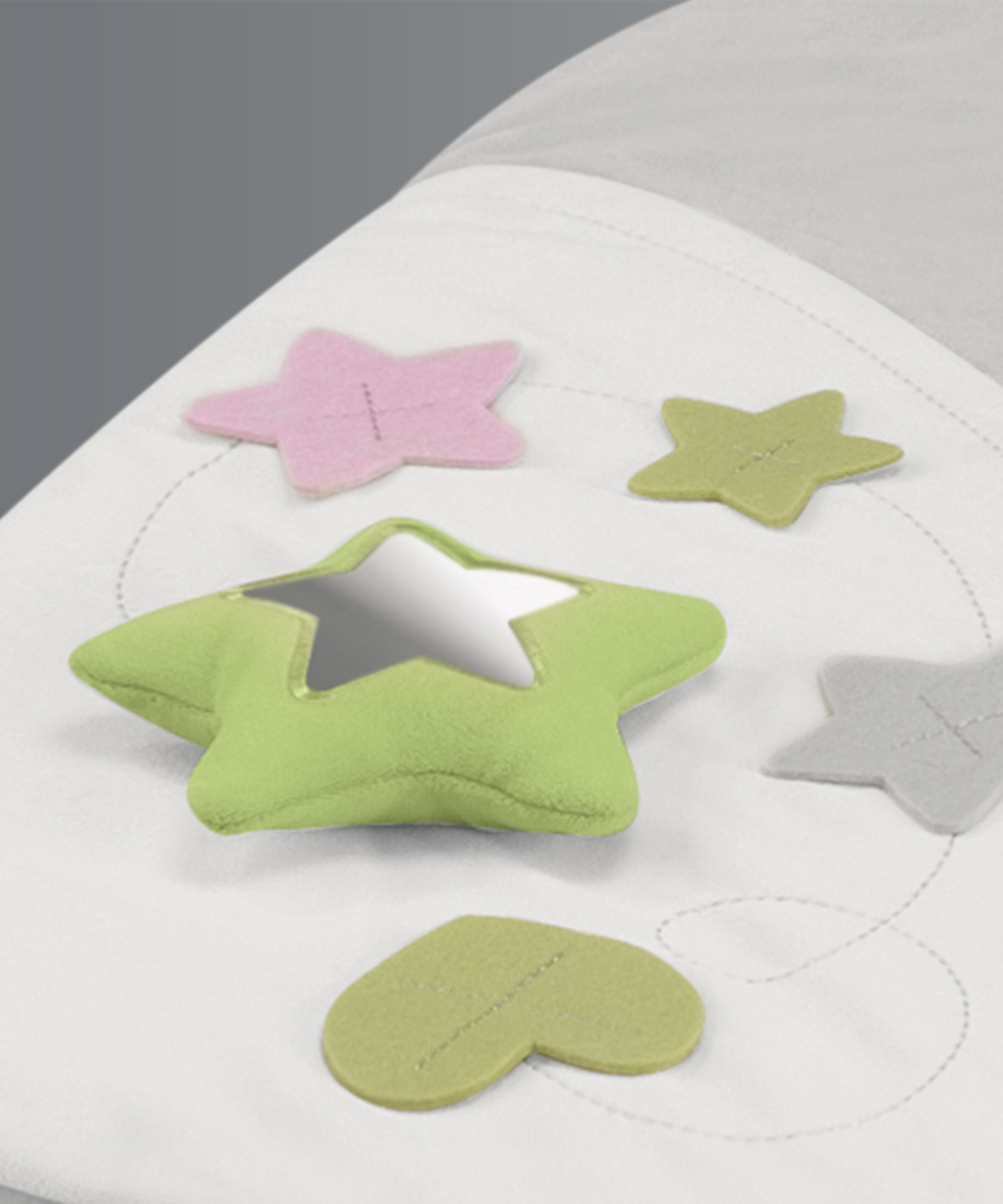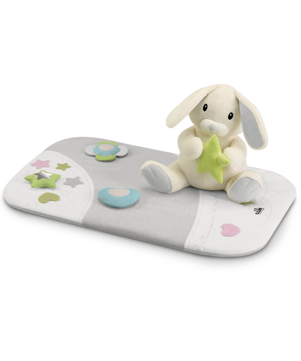 Karakteriristike: • Veoma jednostavno se čisti pomoću sunđera • Višenamenska prostirka za igranje sa malom igraonicom, sa dvostrukom namenom kako beba raste, sa igračkama, zvezdicama, zekom, ogledalcetom..., koji mogu biti fiksirani za prostirku kada su u pitanju manja deca i za držace kada su u pitanju starija deca • Presvlaka se može skinuti i prati na 30°C • Kompaktno sklapanje