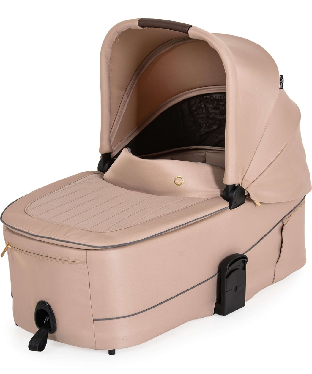 U prvim mesecima beba koristi korpu za novorođenče, u kojoj leži potpuno ravno, zaštićena i udobno smeštena. Korpa je lagana, sklopiva i ima ergonomsku ručku presvučenu PU kožom, pa se lako prenosi. Tenda je vodootporna, sa UV50+ zaštitom i mrežastim delom za ventilaciju, dok mekani dušek sa skidajućom navlakom omogućava jednostavno održavanje.