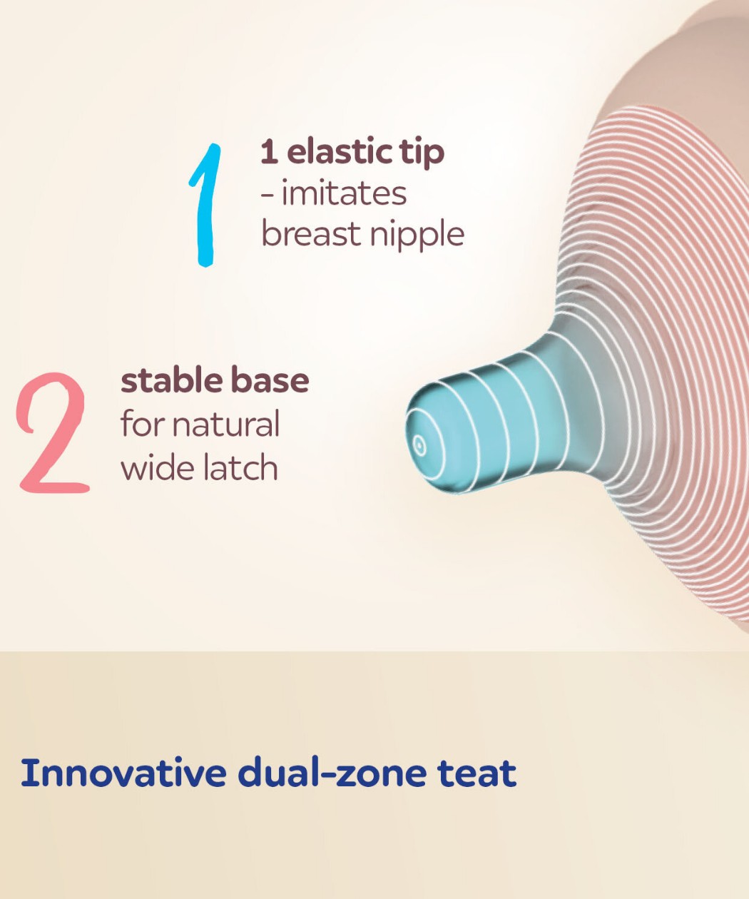 Razvijena u saradnji sa neurološkim logopedima, ova cucla je kreirana da zadovolji potrebe roditelja koji kombinuju dojenje i hranjenje na flašicu, kao i majki koje isključivo koriste pumpice.