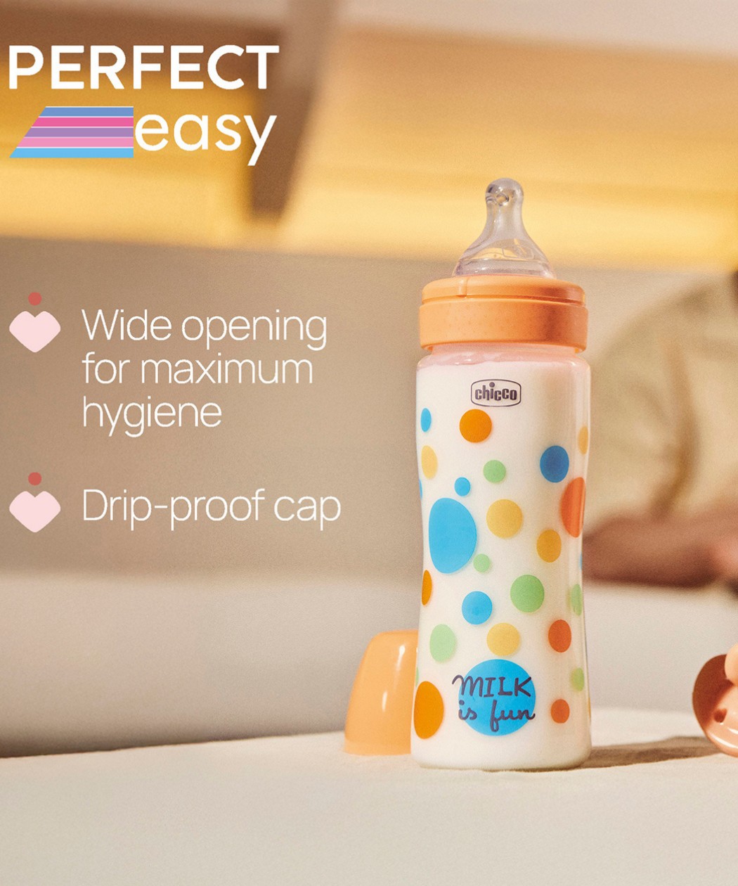 • • Chicco PERFECT EASY staklena flašica garantuje maksimalnu praktičnost zahvaljujući svom ergonomskom obliku, pogodna je za sterilizaciju i može se prati u mašini za sudove