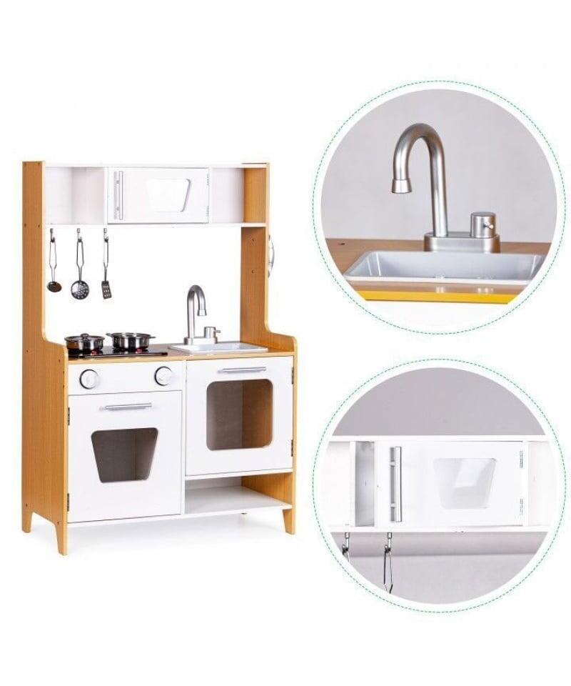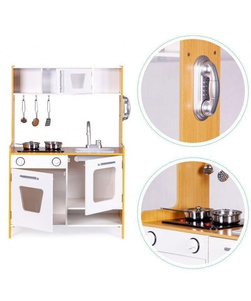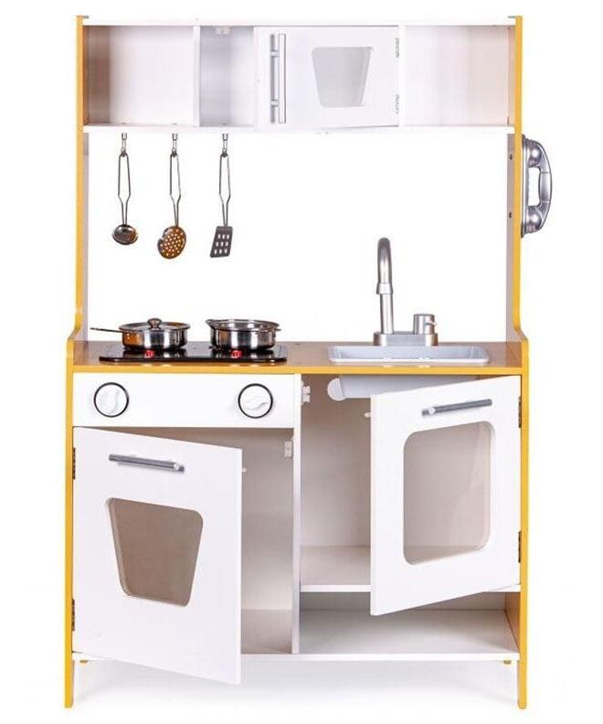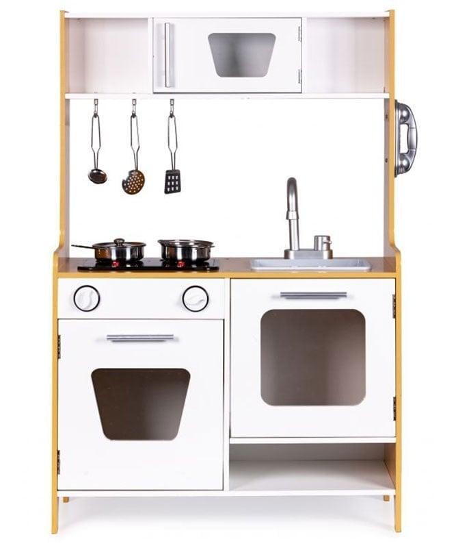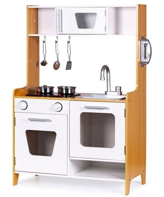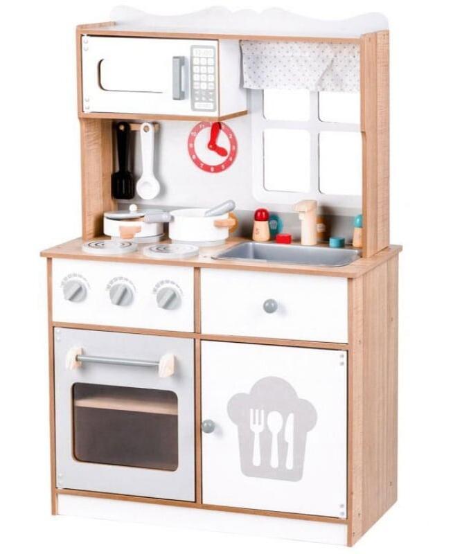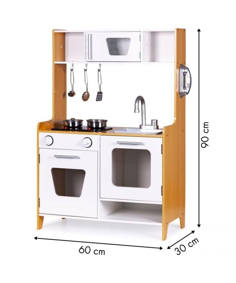 Velika drvena kuhinja biće savršena za decu koja vole da kuvaju. Šporet ima otvorenu rernu i veliki orman za otvaranje. Na vrhu igračke je gorionik koji sija i proizvodi zvuk ključale vode. Kuhinja takođe ima dve kvake, slavinu za sudoper, telefon i mali ormarić sa policama na vrhu. Komplet sadrži 5 metalnih dodataka sa kuhinjom.