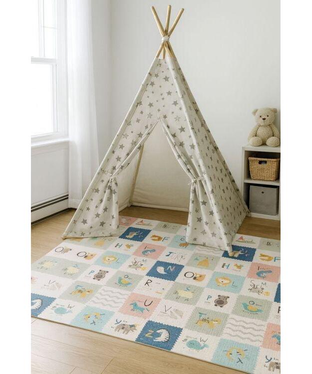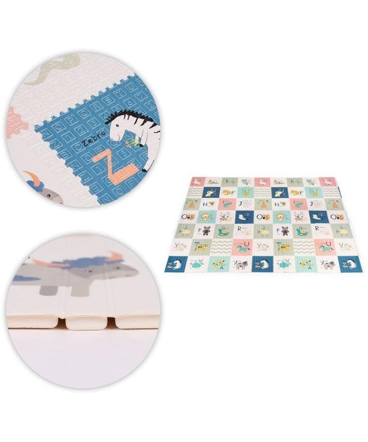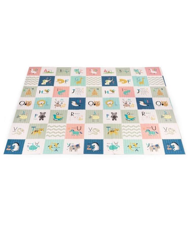 Zahvaljujući protivkliznoj teksturi, jastuk ostaje na mestu tokom igre, obezbeđujući stabilnost i sigurnost. Dvostrani print sadrži abecedu sa engleskim rečima na jednoj strani, a ilustracije životinja i prirode na drugoj, podstičući maštu i podržavajući učenje. Dodatno, merni grafik omogućava praćenje rasta deteta. Lagan, sklopiv dizajn i priložena torba za nošenje olakšavaju čuvanje i transport jastuka bilo gde.