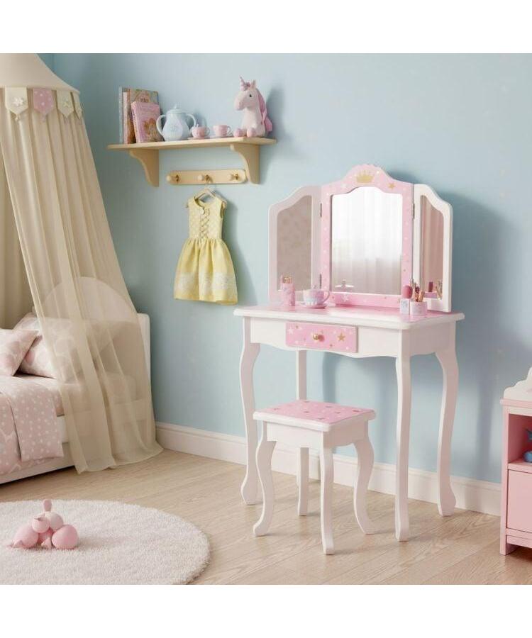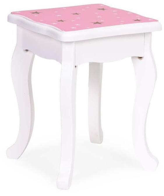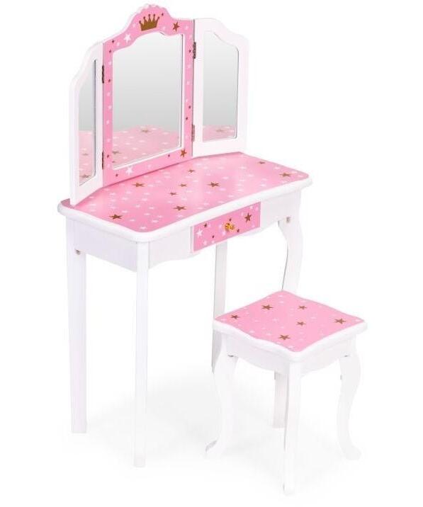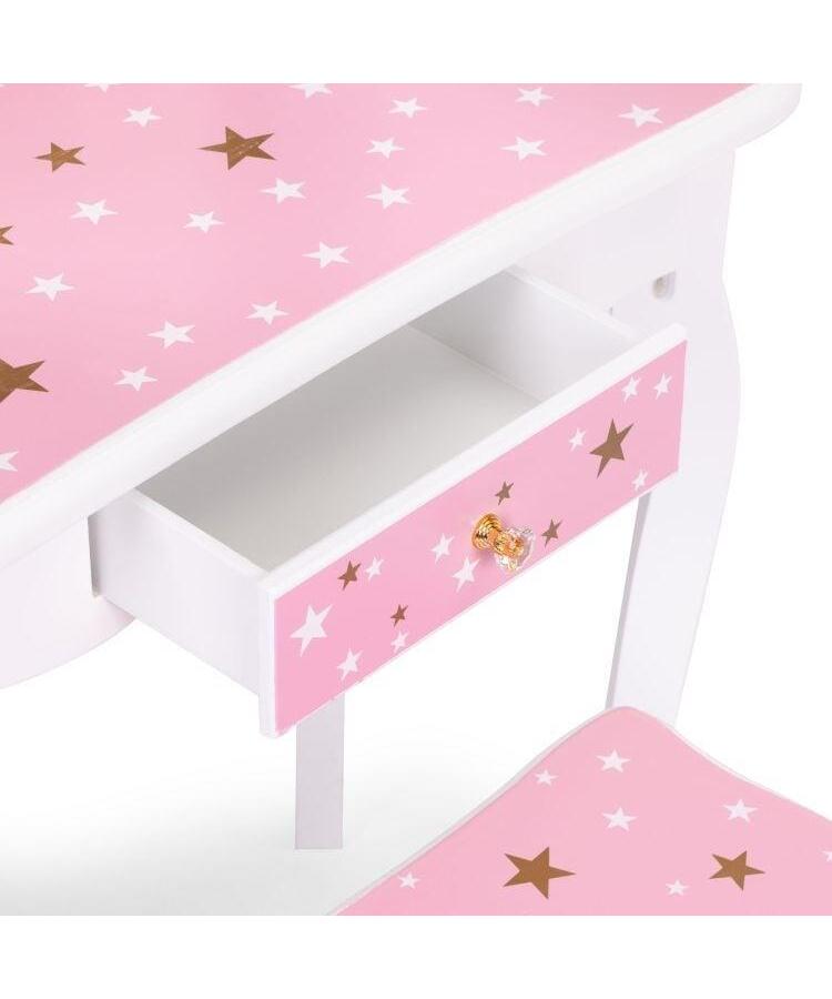 Roze ram sa zvezdicama i zlatnom krunom stvara zaista bajkovitu atmosferu. Ispod radne površine nalazi se praktična fioka sa ručkom – savršena za čuvanje malih blaga. Set takođe uključuje udoban tabure, savršeno prilagođen visini stola za svakodnevnu igru.