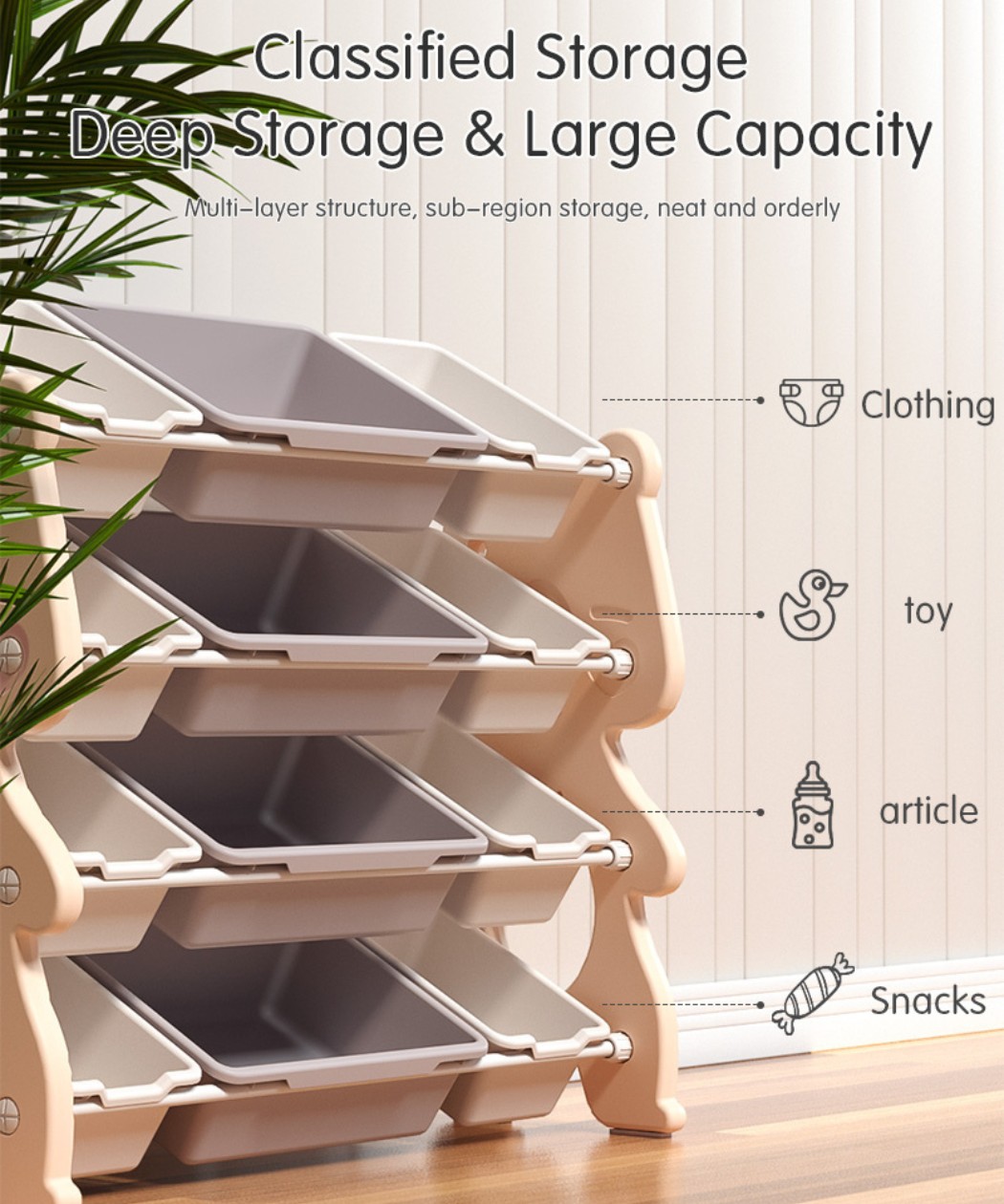 Praktični sistem za odlaganje modernog i stabilnog dizajna u obliku mede omogućava dostupno skladište za igračke, podstičući organizacione sposobnosti dece.