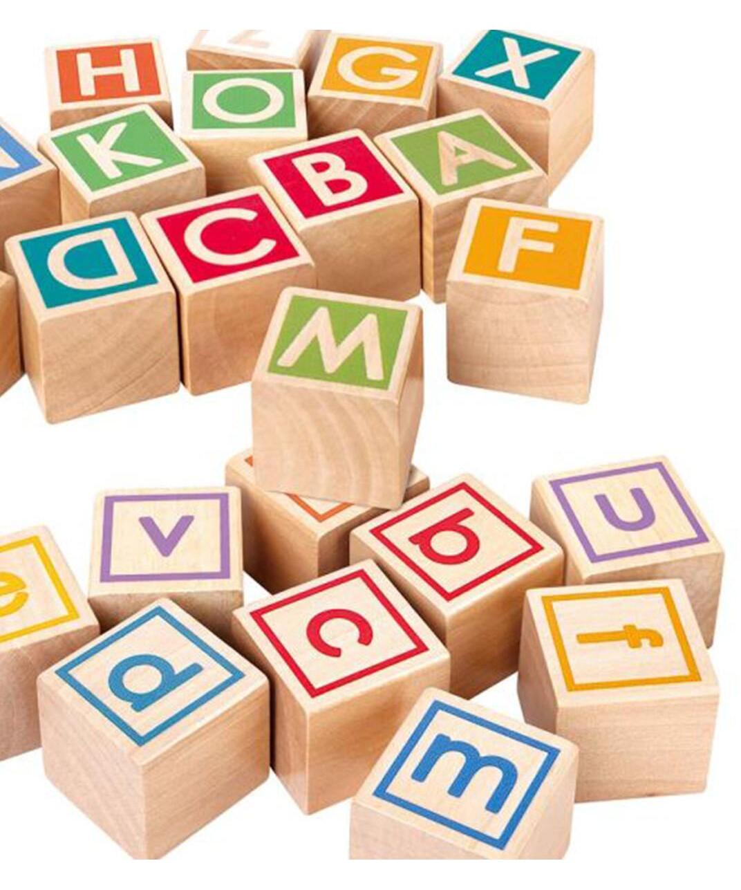Kolica sa 26 blokoa napravljenih od različitih slova i boja. Dvostrani blokovi prikazuju verzije velikih i malih slova.