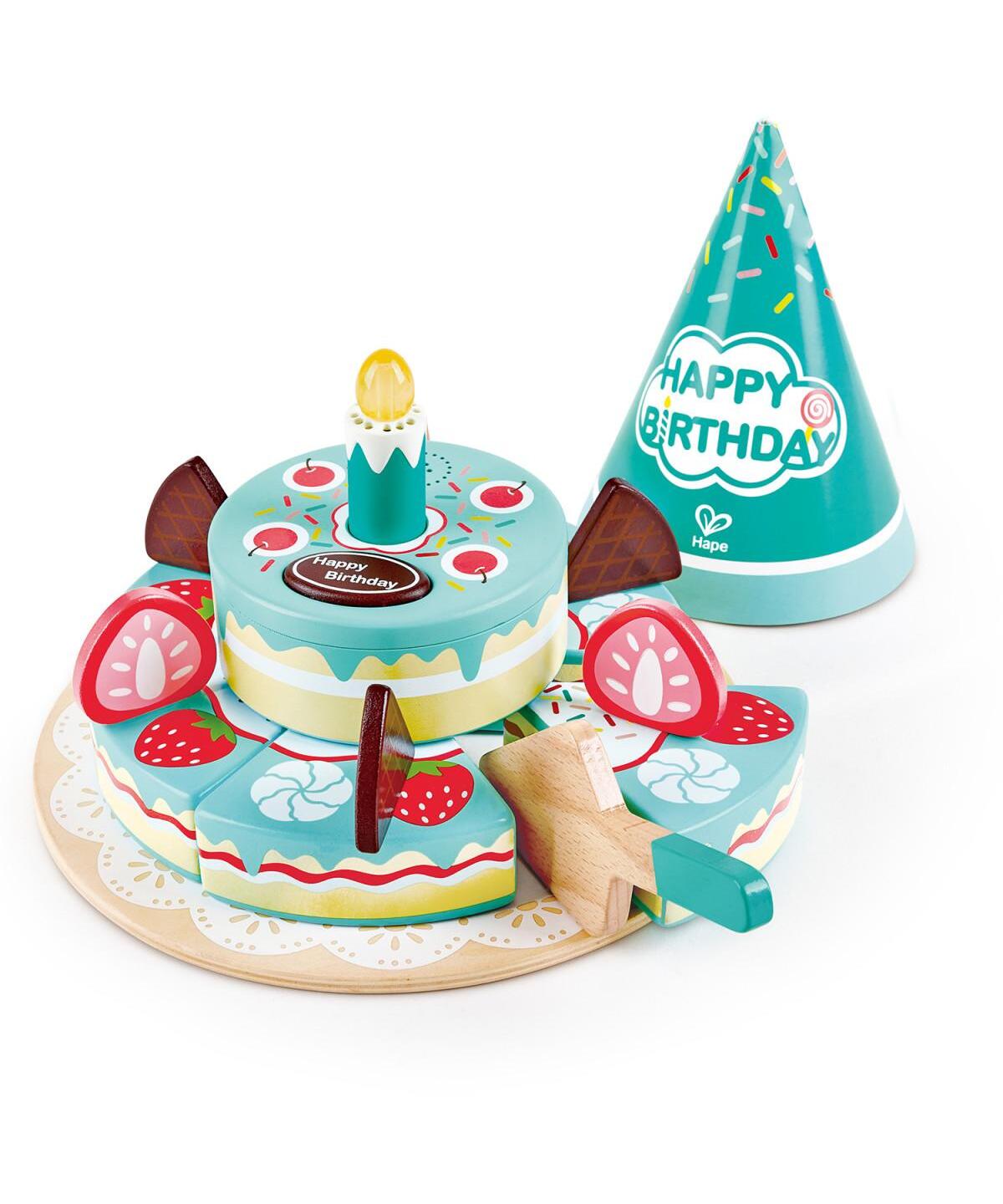 U veselim i nežnim bojama, ova drvena torta ima dva sprata, 6 parčića torte, špatulu i brojne druge dekoracije, a u setu dolazi i rođendanska kapica.