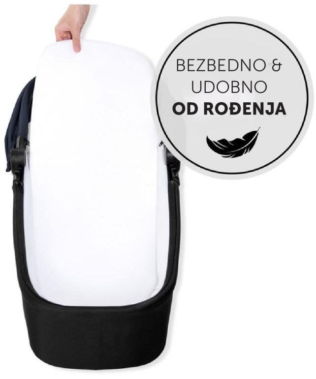 Prostrana nosiljka sa postavljenim dušekom i navlakom koja se može prati, nudi bezbedno okruženje i ergonomski položaj za ležanje. Vaša beba ima mesta u njoj do 9kg. Visokokvalitetne tkanine su izdržljive i dugotrajne. Takođe, nosiljku je veoma lako postaviti na okvir. Tenda pruža UPF 50+ zaštitu od sunca, a navlaka koja se može skinuti štiti Vašu bebu od svih vremenskih prilika.