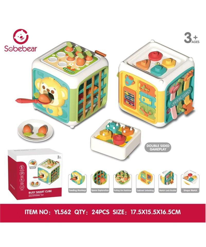 Kroz igru dete može da ubacuje i sortira oblike, koristi alatke, otvara i zatvara vrata, pomera kuglice i razvija spretnost ruku.