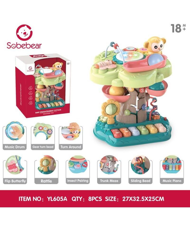 Igračka sadrži više različitih aktivnosti i funkcija koje uključuju svetlo, muziku, dugmad, oblike i pomične elemente. Dete može da pritiska, rotira i ubacuje različite oblike, razvijajući pritom maštu, pažnju i spretnost.