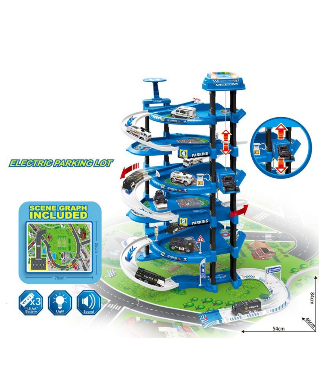 HK Mini Guma parking je impresivan 3D set koji kombinuje parking garažu, trkačku stazu i interaktivne efekte u jednoj atraktivnoj igrački. Set je oblikovan kao velika sportska guma koja se otvara i pretvara u vertikalni parking sa više nivoa, stazama i trkačkim autićima. Više nivoa za spuštanje i parkiranje trkačkih autića.