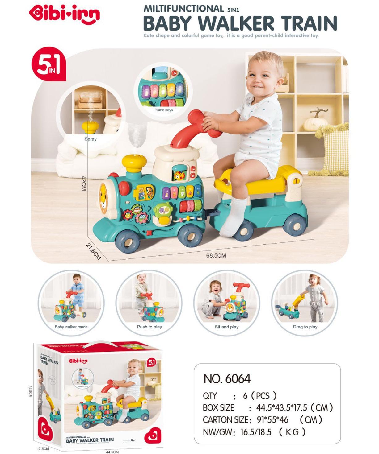 Set sadrži guralicu u obliku vozića i vagon u zelenoj boji. Izrađeni od materijala plastike. Igračka sadrži klavir sa šarenim dirkama, simulacija prozorčića i vrata za otvaranje, telefon, rotirajuće zupčanike i zabavne valjke, sat za učenje vremena i blokove za slaganje i vežbanje fine motorike.