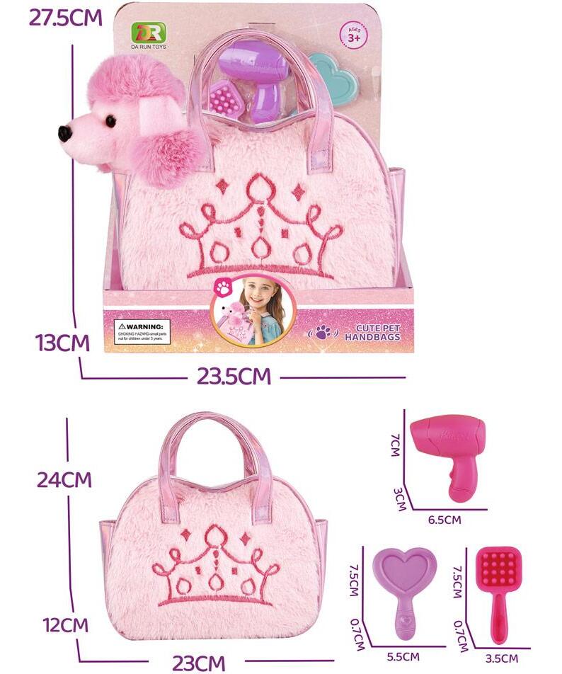 Set sadrži plišanu kucu, torbicu za kucu, češalj, fen i ogledalce.