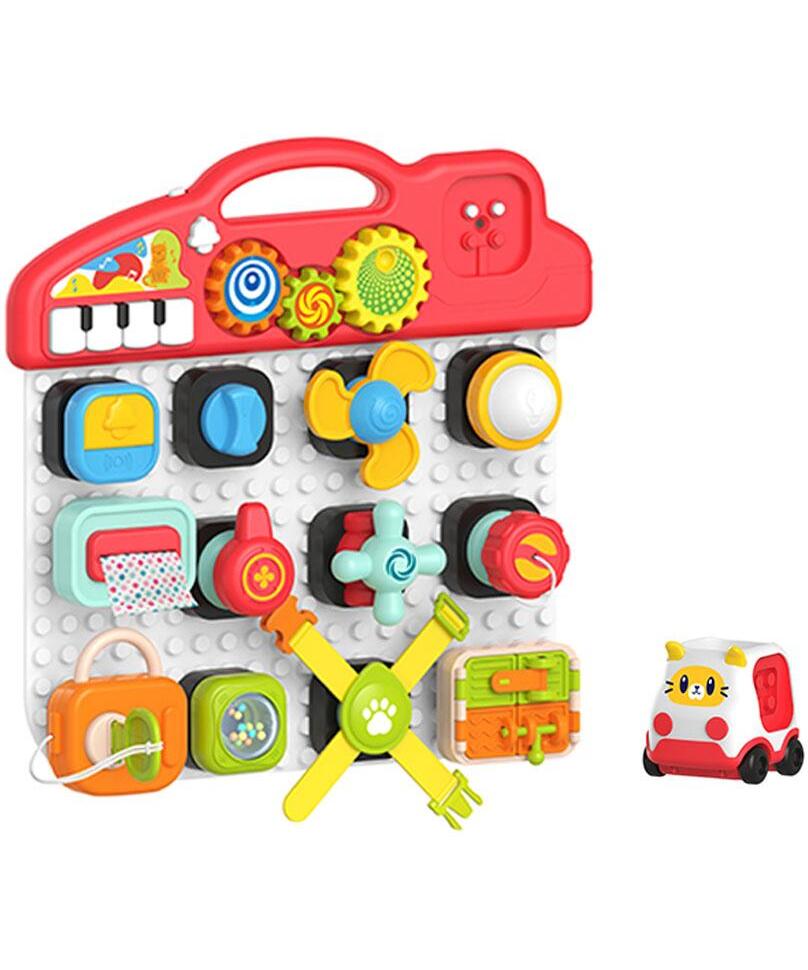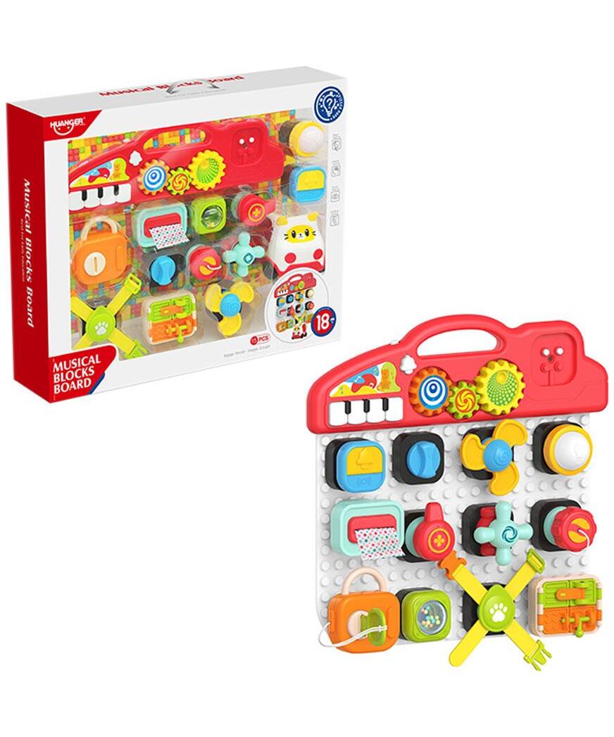 Muzička aktiviti tabla koja se satoji od 15 različitih elemenata za učenje bebe finim motoričkim pokretima koji se koriste tokom svakodnevnih aktivnosti kao što su: zavrtanje i odvrtanje slavine, izvlačenje maramice, otključavanje vrata i slično.