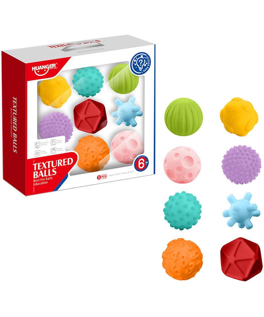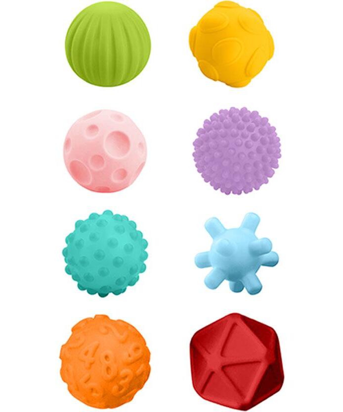 Set 8 senzornih lopti razlicite teksture u bojama: zelena, roze, svetlo plava, narandžasta, žuta, ljubičasta, plava, crvena.