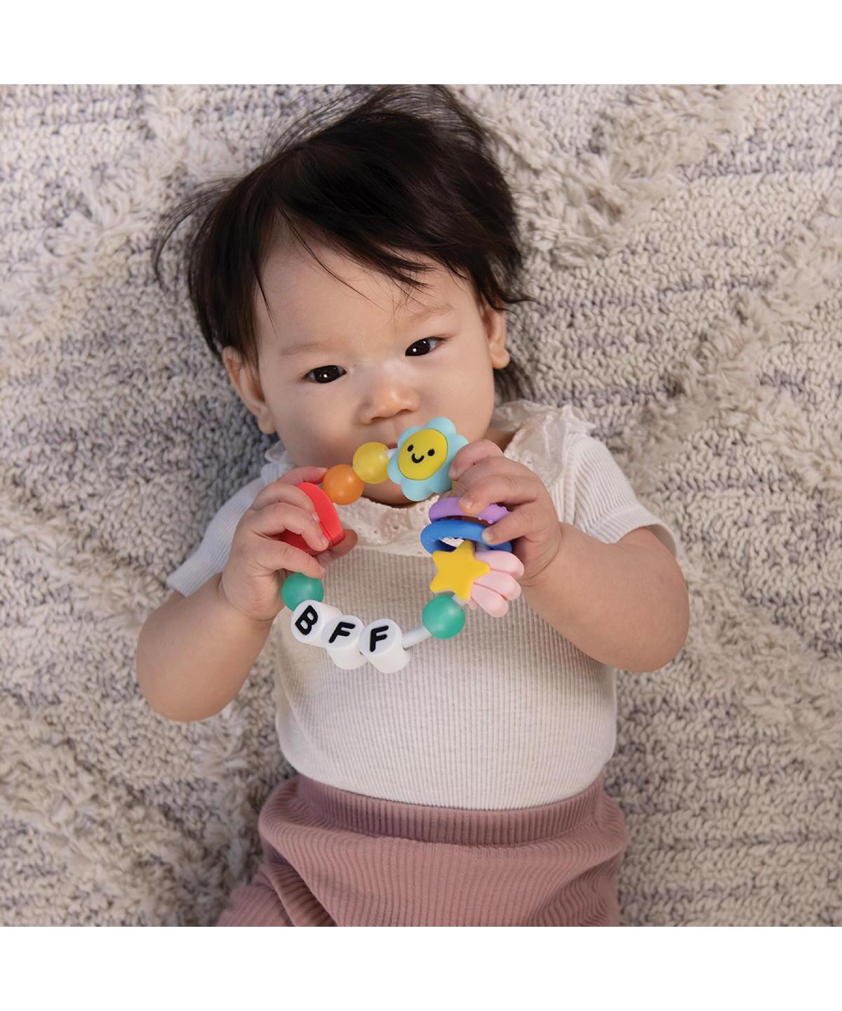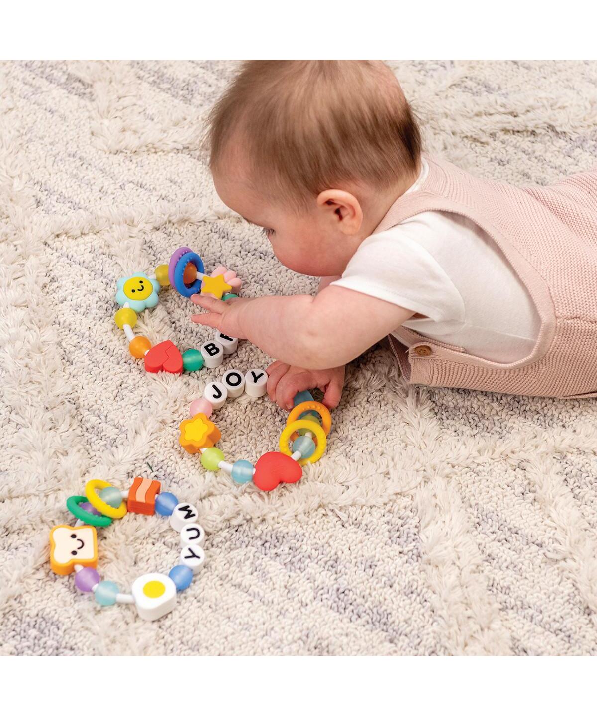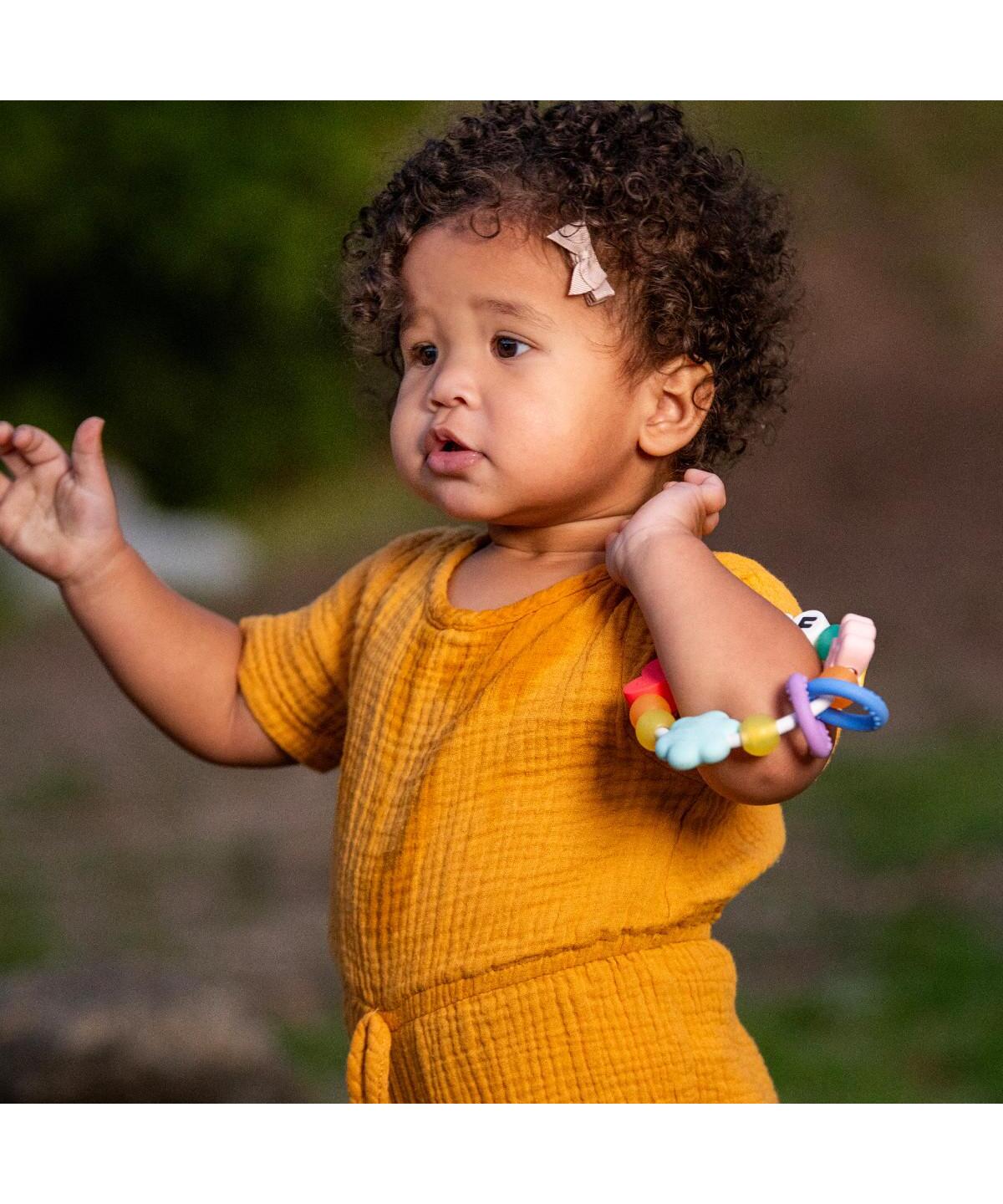 Mekana i sigurna za grickanje, uveseljava bebe svojim oblicima, teksturama i bojama, dok istovremeno pomaže u razvoju fine motorike i ublažava nelagodnost kod nicanja zubića. Lako se kači i nosi svuda, ona je omiljeni detalj svakog dana.