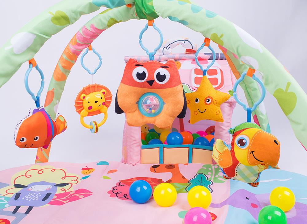 Jungle podloga za igru za devojčice je raznovrsna gimnastika za devojčice 3 u 1 koja sadrži mekane viseće igračke, loptice i kuću za odlaganje loptica.