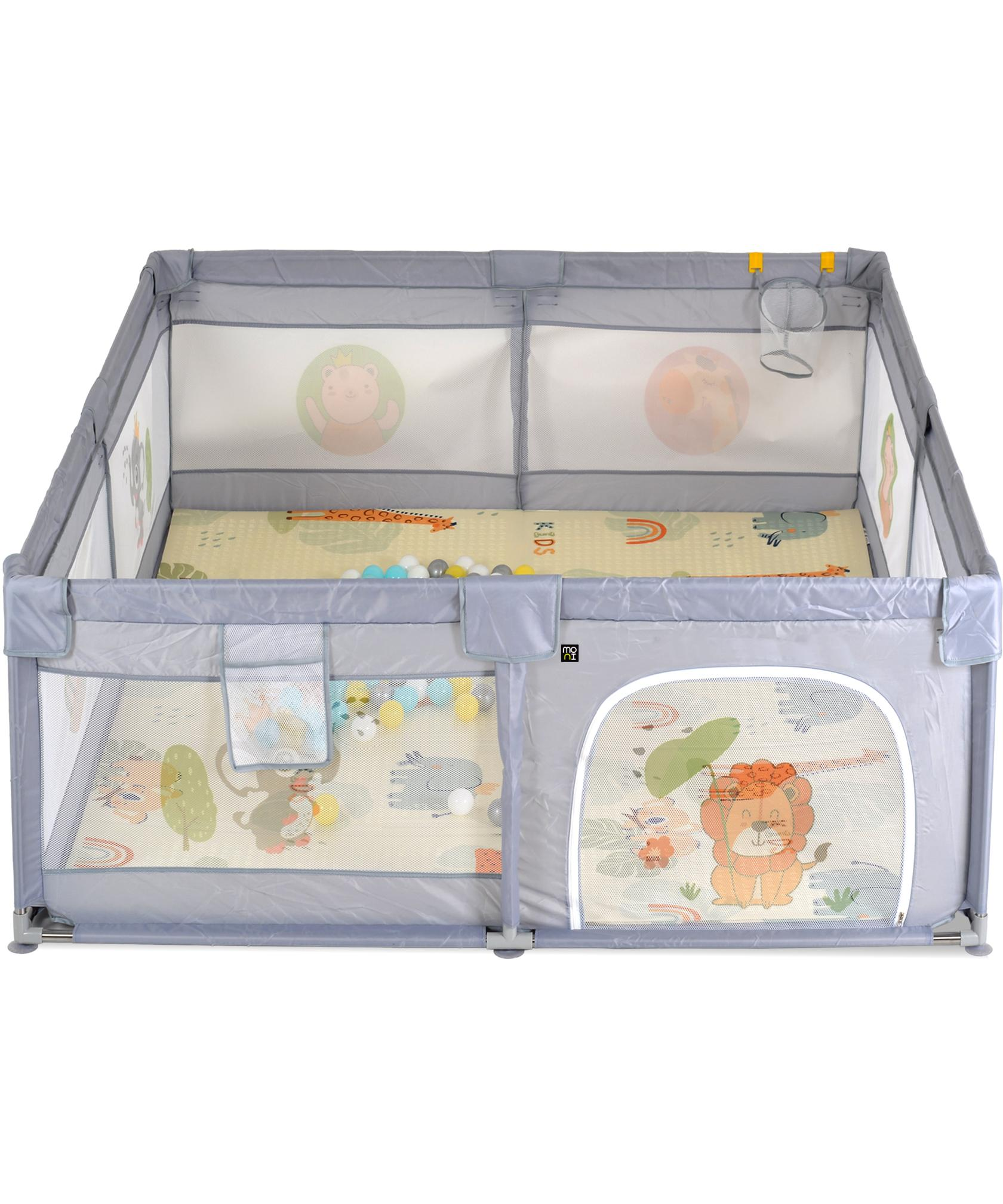 GameZone ogradica za igru pruža detetu siguran i prostran prostor za igru, uz mekanu podlogu, loptice i dodatke poput koša i karika koji podstiču razvoj.