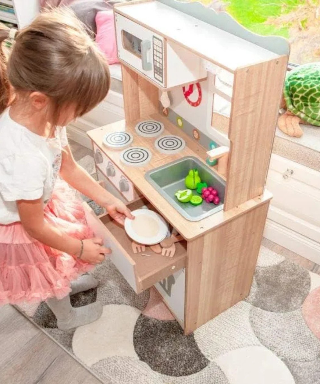 Ova sigurna igračka je napravljena od visokokvalitetnih materijala i uključuje rernu, sudoperu, osvetljene ringe, frižider i šporet sa zvučnim efektima.