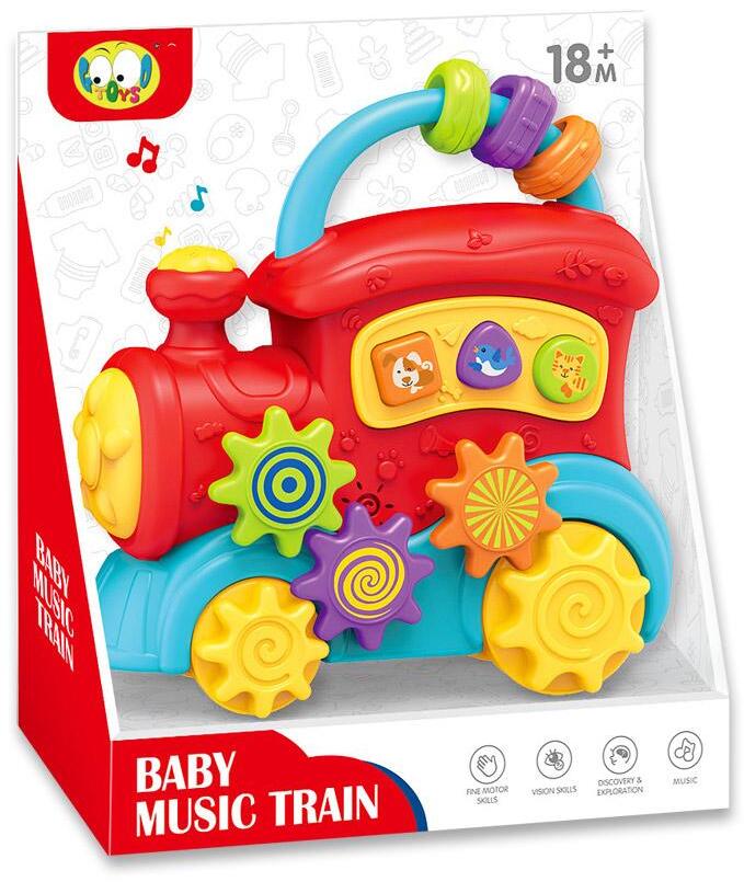 Na dugmićima različitog oblika ilustrovani su kuca, maca i ptičica, dok su točkovi voza ujedno i zupčanici koji se okreću.