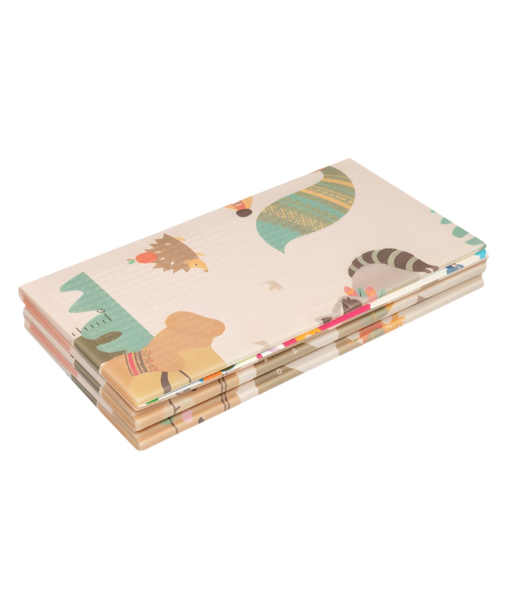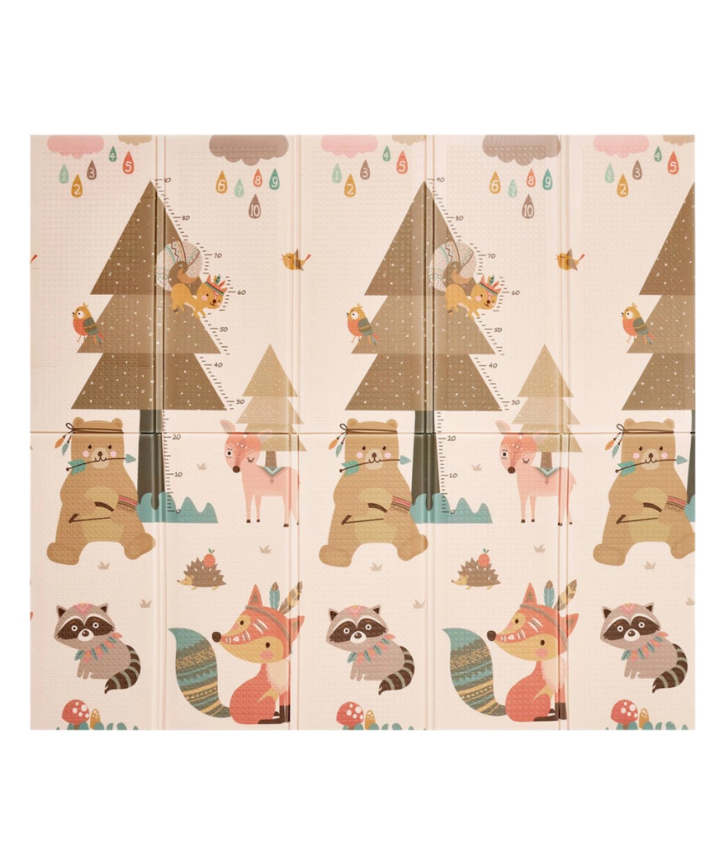 Motivi nisu slučajni. Jedna strana donosi mirnu šumsku priču sa lisicama, medama, drvećem, dok druga prikazuje razigrane indijanske scene sa lisicama, sovama, šatorima i totemima. Promenom strane menjate atmosferu igre i održavate detetovu pažnju bez dodatnih igračaka.