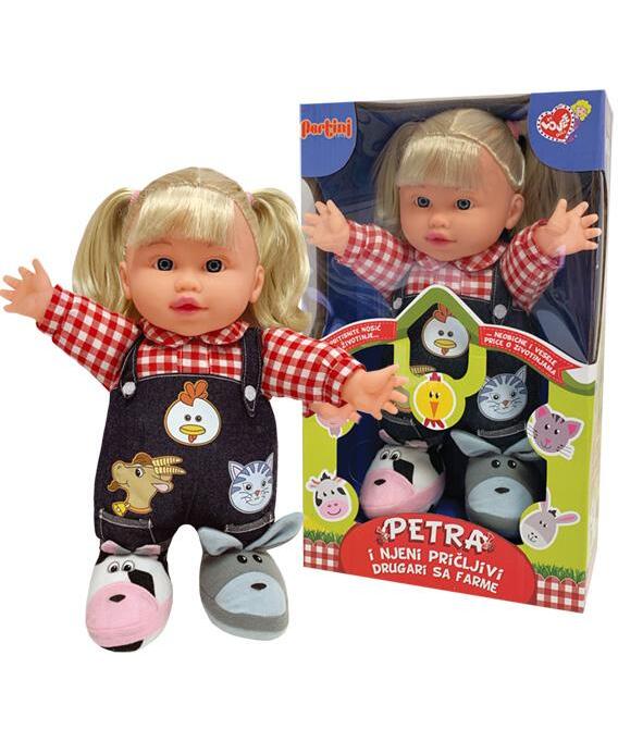 Interaktivna lutka Petra i njeni drugari sa farme. Lutka na svojoj garderobi ima 5 interaktivnih životinja - petao, koza, mačka, magarac i krava. Pritiskom na svaku životinju lutka daje opis te životinje kao i njene funkcije na farmi. Video pogledajte