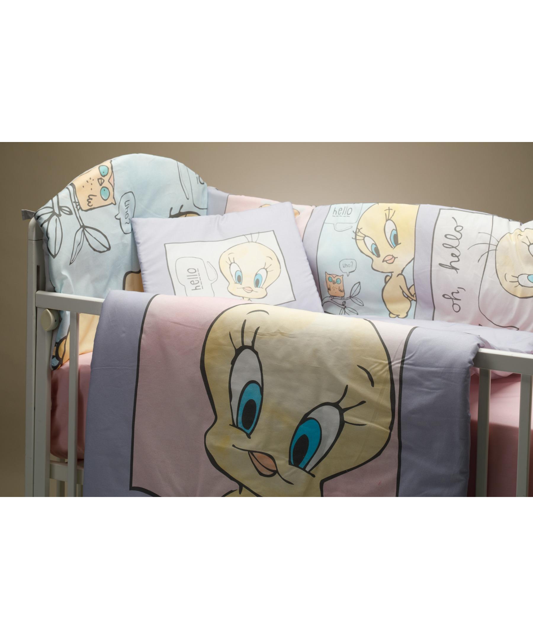 Komplet posteljine za bebe se uglavnom proizvodi po dimenziji dušeka 120 x 60 cm i uglavnom set uključuje: ogradicu za krevetac (tri dela), jorgan, jorgansku navlaku, čaršav za dušek, jatuče i jastučnicu. U Kiddy JOY svi kompleti posteljine su proizvedeni od 100% pamuka i ponosimo se sledećim proizvođačima posteljina: Bertoni, Textil.