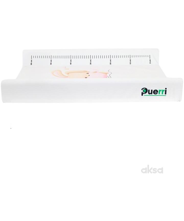 Puerri čvrsti pult za presvlačenje idealan je za svakodnevnu negu vaše bebe od rođenja. Na površini se nalaze jasno ucrtane mere koje olakšavaju praćenje bebinog rasta. Pult je obložen vodootpornim materijalom koji omogućava jednostavno i brzo čišćenje – dovoljno je prebrisati vlažnom krpom ili maramicom. Karakteristike: