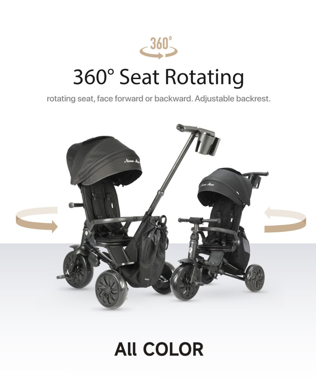 Za maksimalnu udobnost deteta tu su rotirajući i podesivi naslon, kao i sklopiva ručka za upravljanje, koja omogućava sigurnu i kontrolisanu vožnju.