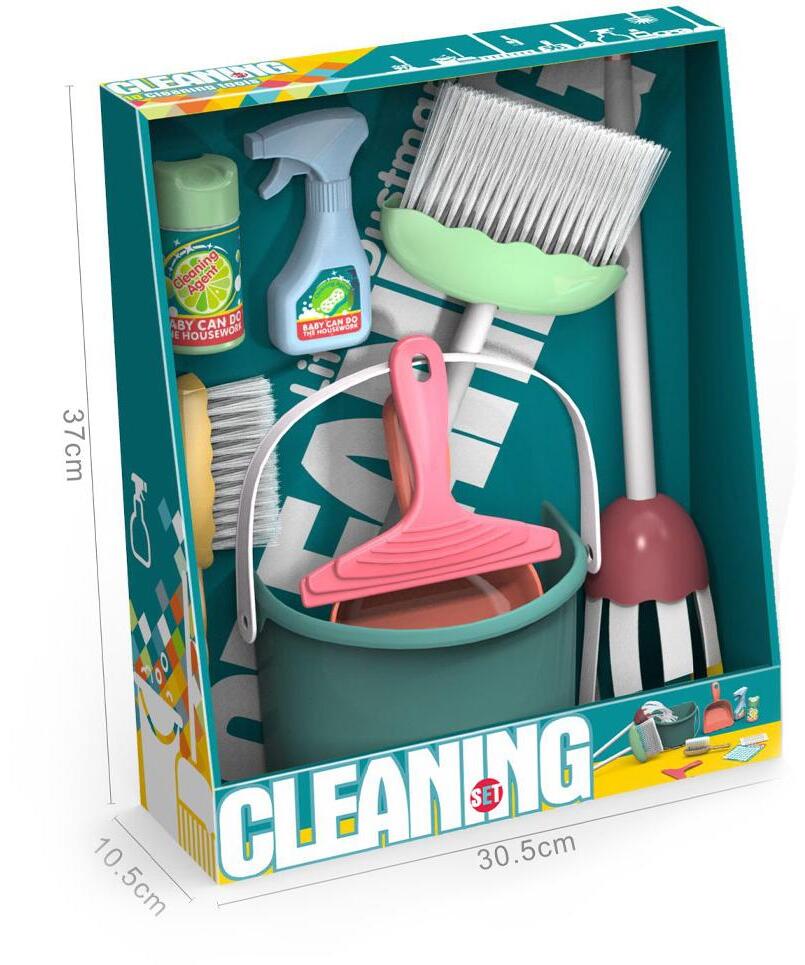Set za čišćenje sadrži lopatu, metlu, kanticu, 2 kartice, 2 sredstva za čišćenje, četku za ribanje, brisač za stakla i mop.
