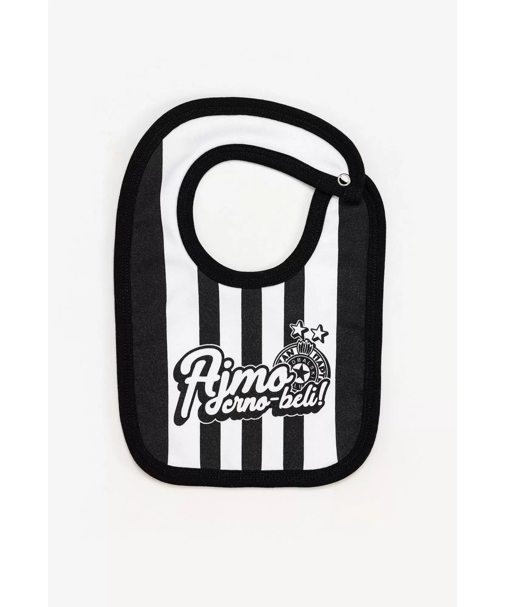 Bebi portikla Partizan – 100% pamuk, meka i upijajuća. Crno-bele pruge i natpis „Ajmo crno-beli!“ za prve navijačke obroke!