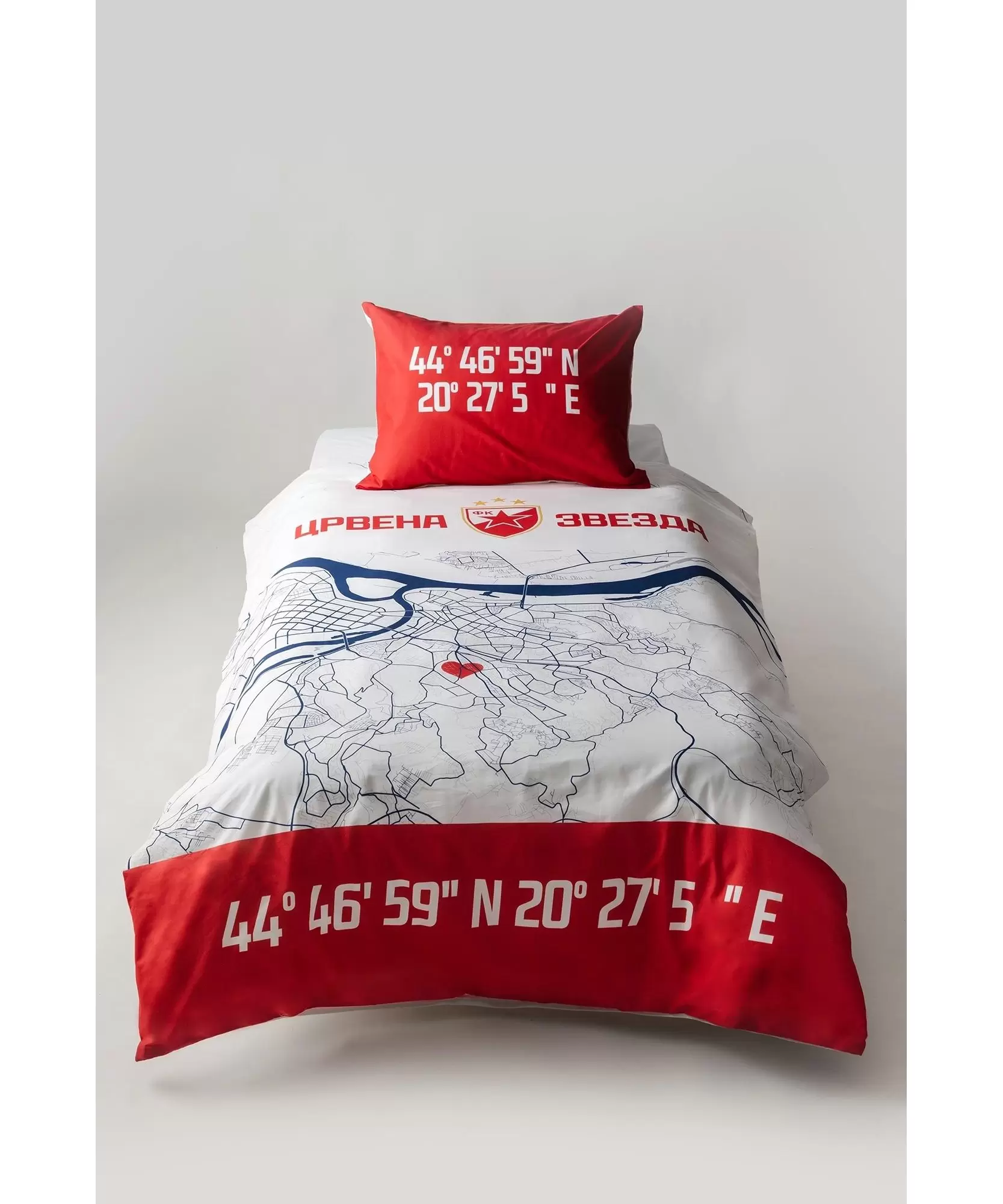 Na jorganskoj navlaci nalazi se odštampana mapa Beograda sa posebnim akcentom na stadion Rajko Mitić, gde je istaknuto crveno srce koje označava mesto ovog legendarnog stadiona. Uz to, tu je i grb FK Crvena Zvezda, koji daje posebnu emocionalnu vrednost ovom setu. Jastučnica je crvene boje, sa geografskim koordinatama stadiona, što je dodatni detalj koji će vas podsetiti na mesto koje svi zvezdaši vole.