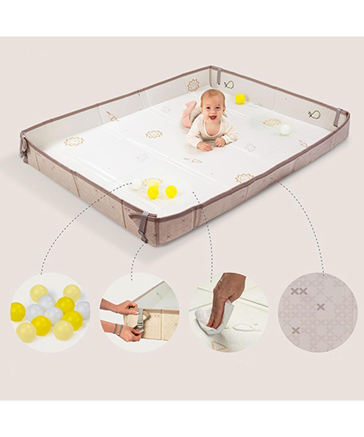 Dvostrana sa živopisnim dezenima, podstiče emocionalnu inteligenciju. Njegovi jedinstveni zidovi koji se savijaju stvaraju sigurnu zonu za igru, zadržavajući igračke i loptice dok beba oseća sigurnost.