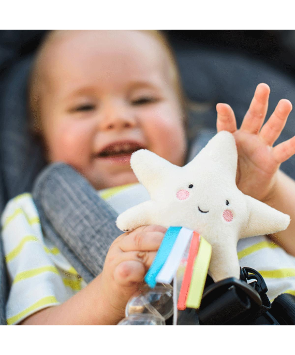 Za zvezdu su zakačene šarene trake za taktilno istraživanje. Dizajnirana tako da male ruke mogu lako da drže providan štapić.