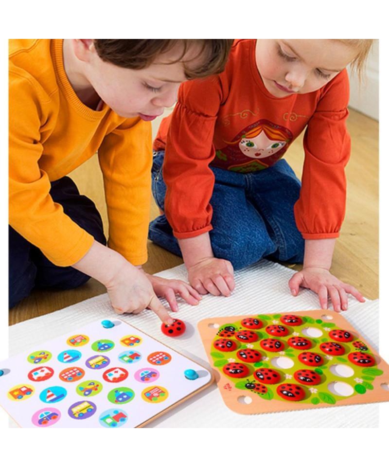 Igra memorije postaje još zanimljivija ukoliko je krase slatke bubamare! Standardna memorijska igra koju zabavnijom čini to što se ispod svake bubamare na tabli nalaze simboli koje deca treba da nauče i zapamte i povežu odgovarajuće parove. Na ovaj način se poboljšavaju koncentracija i razvijaju kognitivne veštine kod najmlađih, kao i fokus, jer se dete usredsređuje na ono što treba da se zapamti i uporedi. Izrađeno od ekološki prihvatljivih materijala.