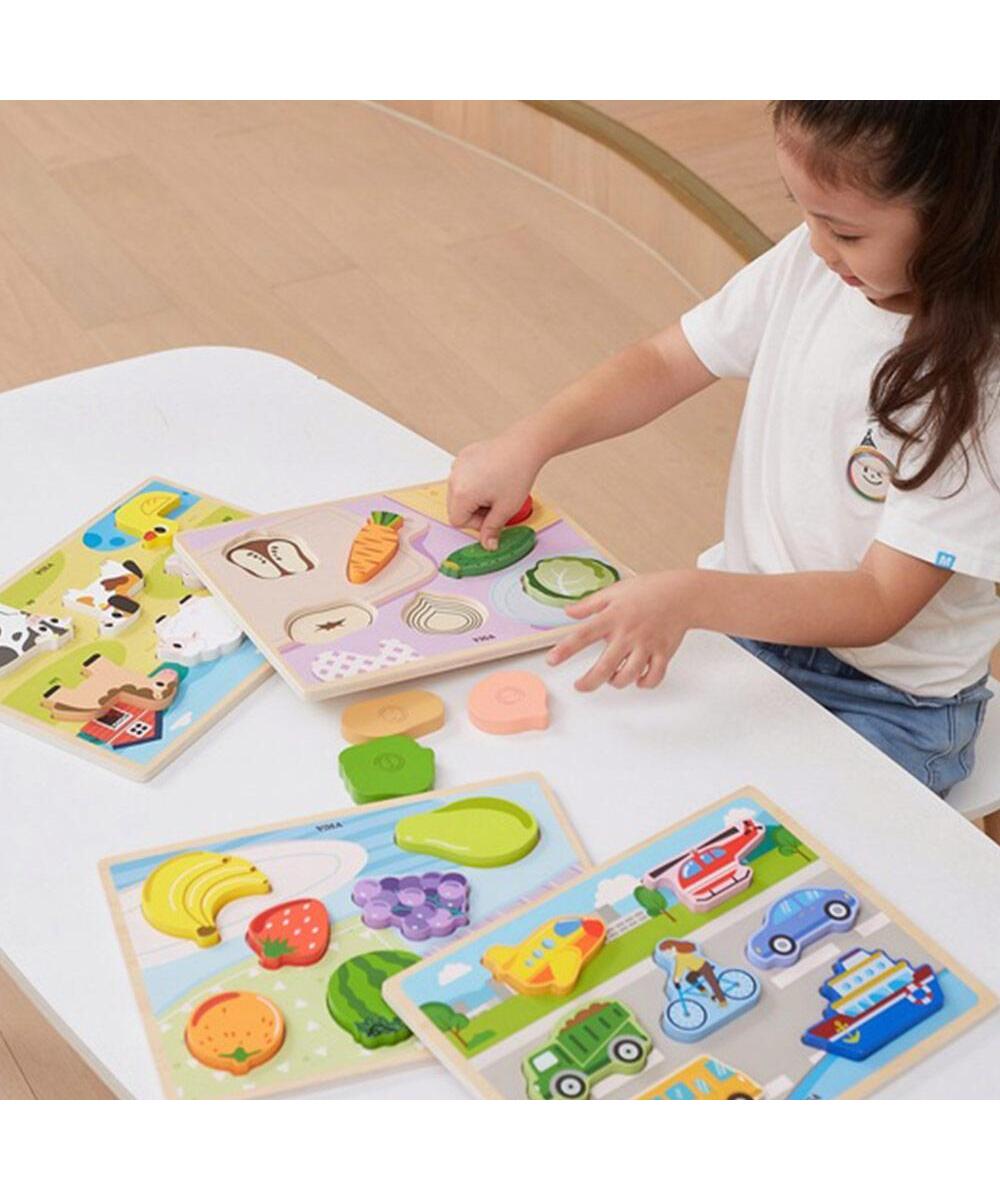 Zahvaljujući debljini elemenata, slagalica se može koristiti za druge igre u vidu figurica. Viga drvena umetaljka podstične opažajni razvoj povezanost slika - pokret, kao i motoriku deteta.