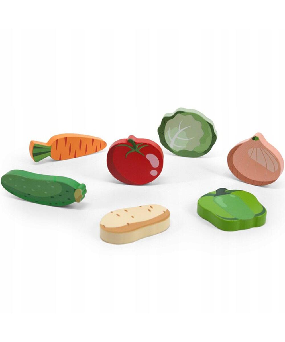 Set sadrži podlogu i 7 drvenih elemenata u obliku voća (paprika, paradajz, krastavac, šargarepa, krompir, luk i kupus).